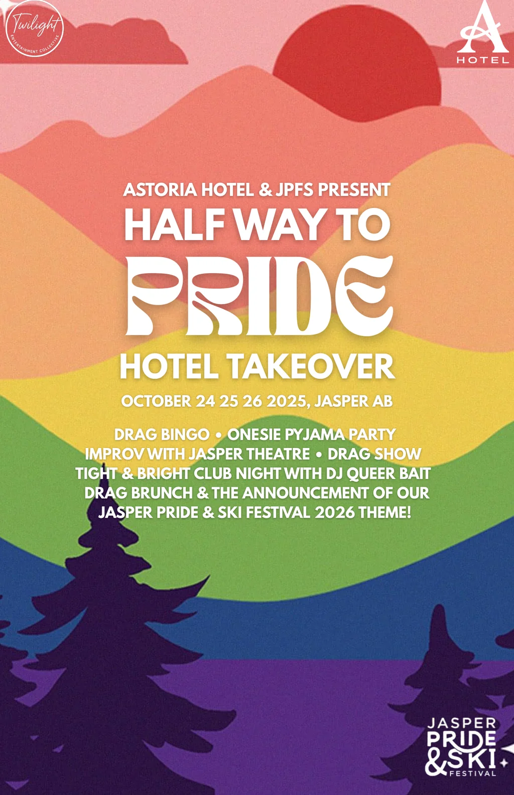 This October, Jasper Pride is taking over the iconic Astoria Hotel , in the heart of downtown Jasper, for a jam packed weekend FUNdraiser for JPFS! πŸŽ‰ From Drag Bingo to Drag Shows, late night DJ parties, improv with Jasper Theatre and Drag Brunch β€” we’re turning the entire hotel into your very own Pride playground. πŸŒˆπŸ’ƒπŸͺ©