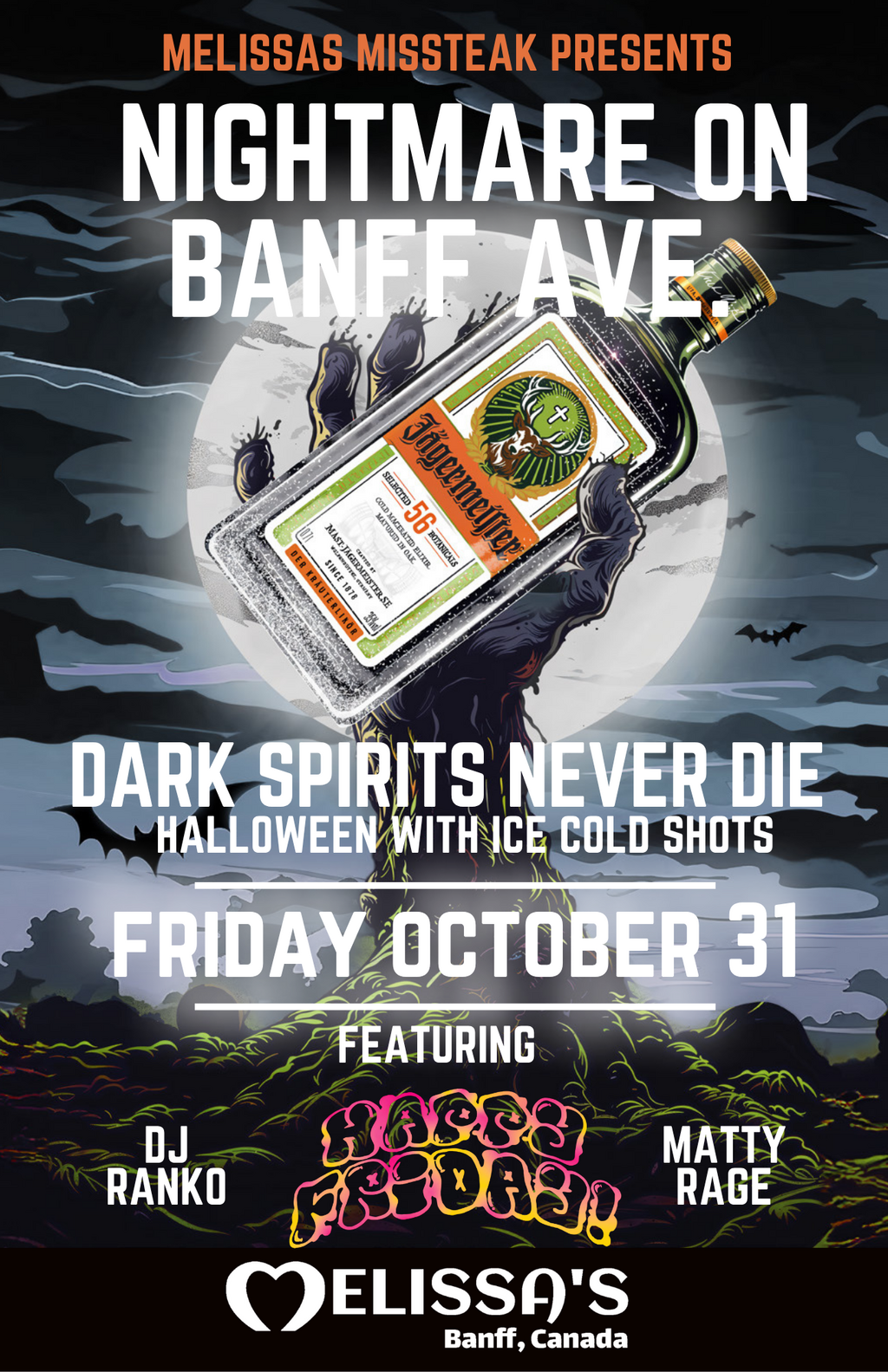 Dark Spirits Never Die. Halloween with ice cold Jagermeifter shots! Come on down as some of the best local DJ's throw down all night long at Banff's Biggest Halloween Party!