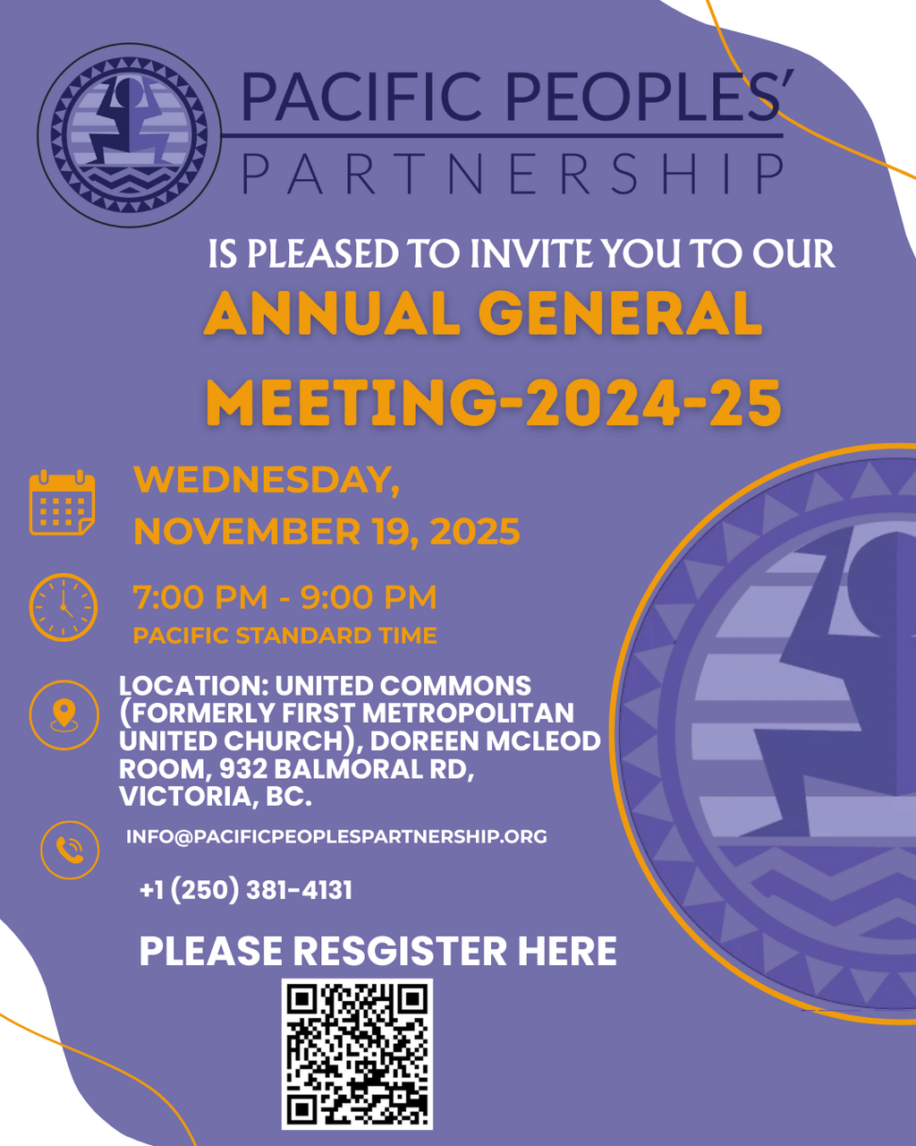 Doors will open at 6:30 PM, and the meeting will begin promptly at 7:00 PM. All PPP members are eligible to attend the AGM and you may bring a friend or family member. Membership includes lifetime members and donors who have contributed in the past year. If you are not currently a member, you may purchase a membership at the door or here: https://pacificpeoplespartnership.org/donate/