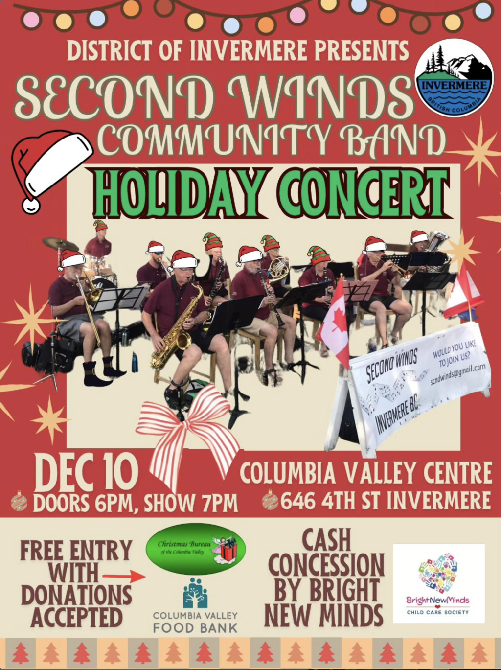 Second Winds Community Band is performing live at the Columbia Valley Centre on December 10th! FREE entry with donations to The Christmas Bureau of the Columbia Valley & Columbia Valley Food Bank will be gratefully accepted. Cash concession run by Bright New Minds Childcare Sociey. Presented by the District of Invermere.