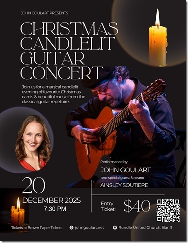Join Award Winning Classical Guitarist John Goulart as he plays some of your favourite Christmas music in a unique Candle Light setting at the historic Rundle United Church in Banff. John will also perform many gems of the Classical Guitar repertoire in this evening of beautiful music.