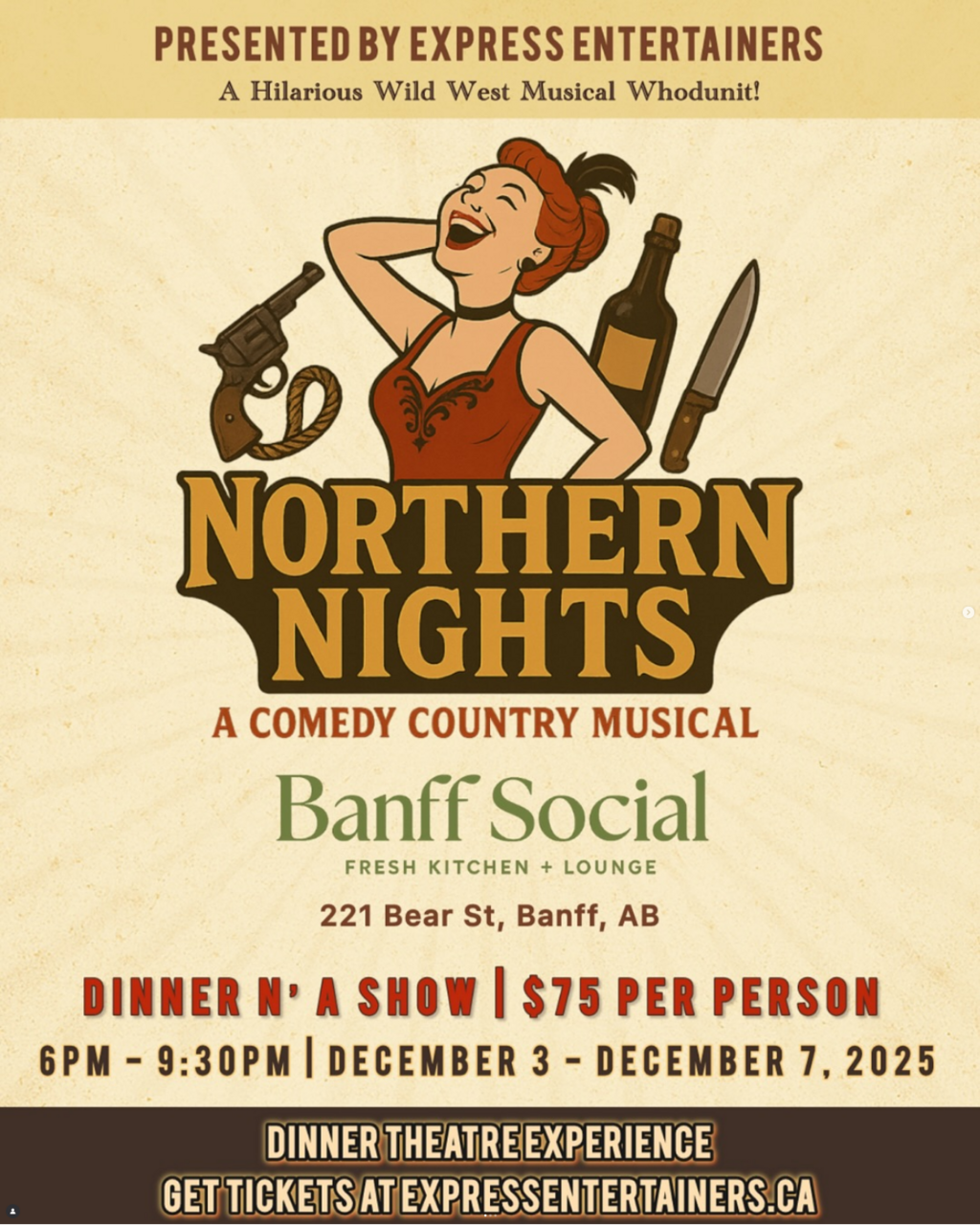 Step into a night of western comedy, music, and mountain mystery at Banff Social’s Northern Nights Dinner Theatre. This exclusive winter event features a Pioneer-inspired menu, including our signature bison pot roast, paired with a high-energy, interactive musical murder-mystery comedy performed by professional singers and actors — all set against Banff’s cozy, fire-lit ambiance.