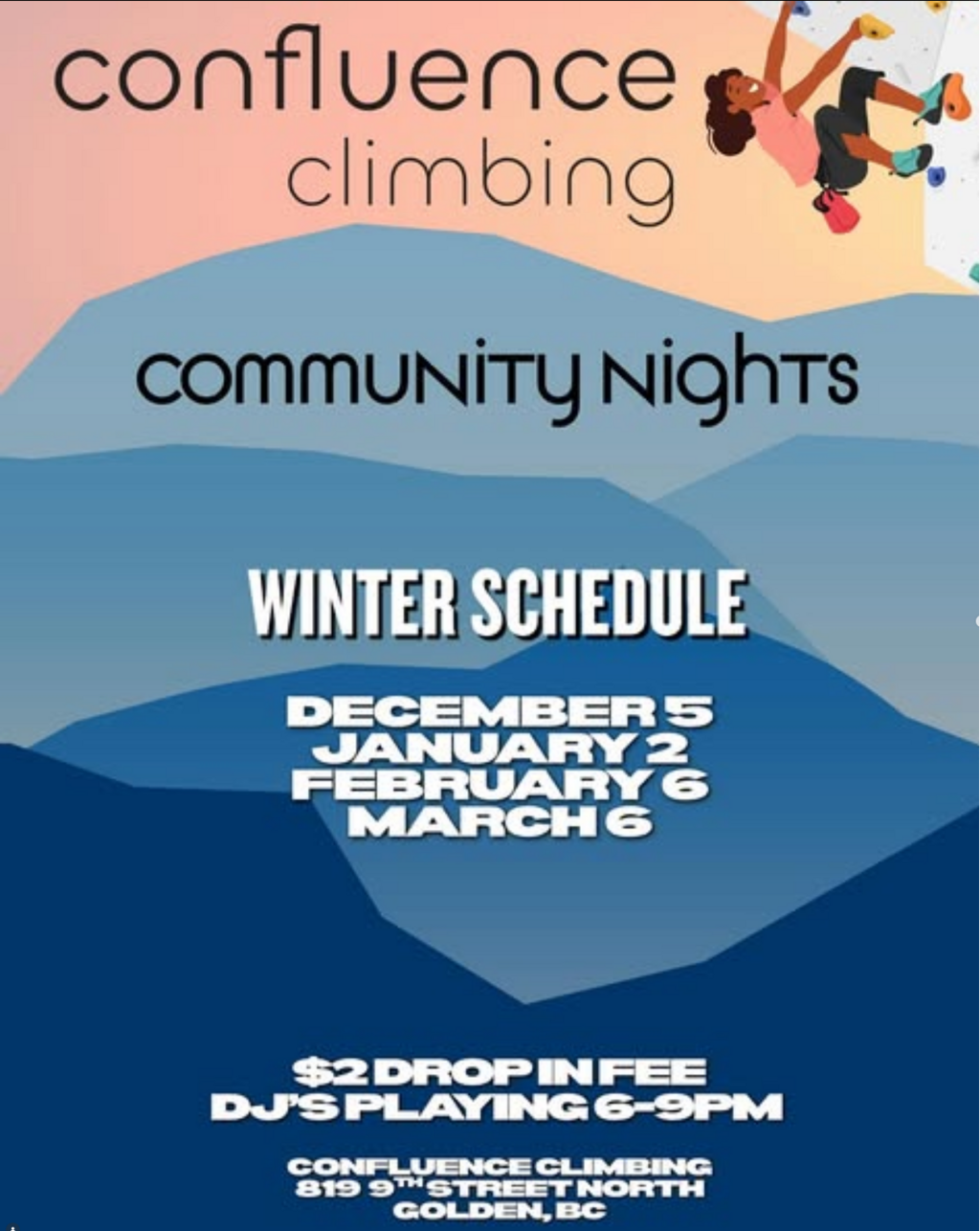 We’re kicking off community nights at Confluence Climbing Gym! This will be a monthly event throughout the winter on the first Friday with a low cost barrier of $2 for a drop in. There will be a coach on hand for the first hour for those who are new to bouldering or just want to improve their skills. We’ll be spinning tunes from 6-9pm and drinks will be available to purchase after you’re done climbing. Looking forward to being a part of this accessible community focused event the next few months and meeting some new friends along the way 🤟