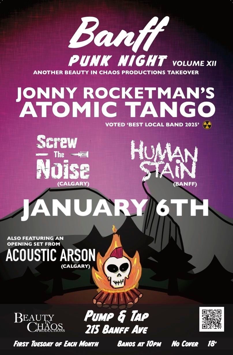 Banff Punk Night returns with the first show of 2026. It's another BIC Productions takeover, and a celebration of Jonny Rocketman's Atomic Tango being named "Best Local Band" in 2025! Joining them are ScrewTheNoise from Calgary, local legends Human Stain, and a special acoustic opening set from Acoustic Arson!
