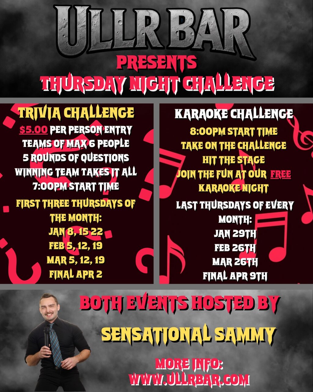 Sensational Sammy is back and bringing the energy for another winter of amazing challenges, laughs, and unforgettable nights at Ullr Bar. Starting Thursday, January 8th, join us every Thursday for a night of excitement.