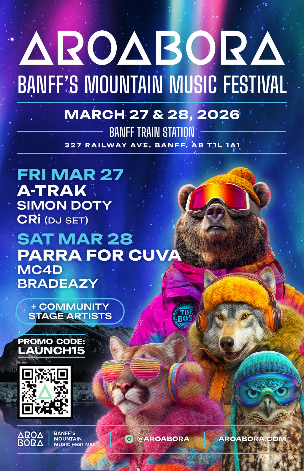 A New Alpine Electronic Music Experience Debuts Beneath the Northern Sky. Aroabora Mountain Music Festival, a two-night electronic music gathering rooted in alpine culture and Boreal Techno, will make its inaugural debut March 27 & 28, 2026 in Banff, Alberta at the Historic Train Station. Tickets go on sale Monday, January 19, 2026.