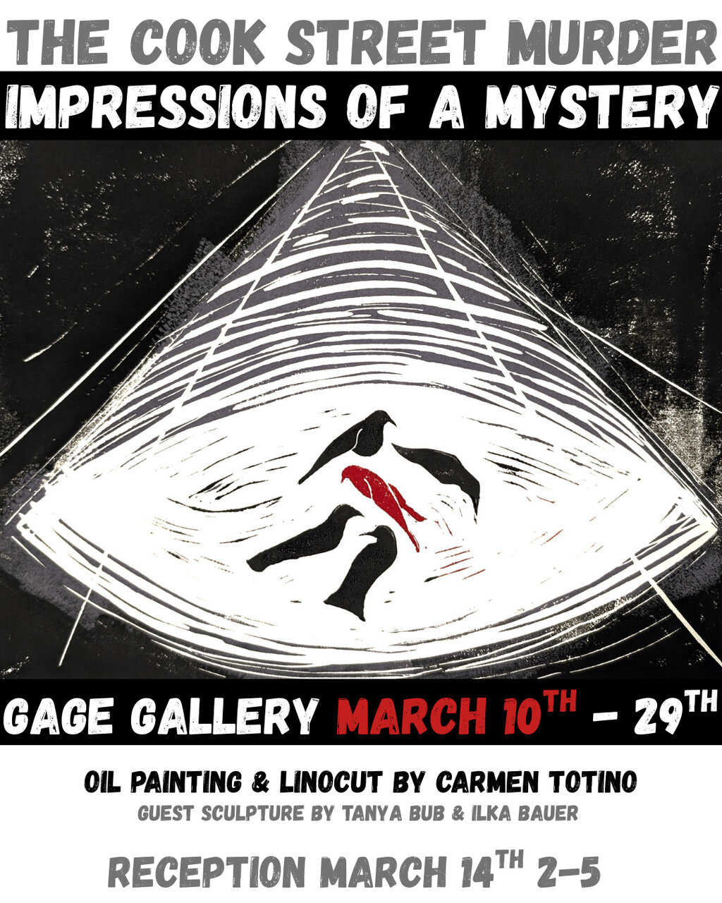 A cat that knows too much and a mysterious murder of crows. Through oil paintings, linocut prints, and sculptures this exhibition conjures a local noir fiction. Familiar places elicit intrigue and every image suggests a story unfolding at the edges.
