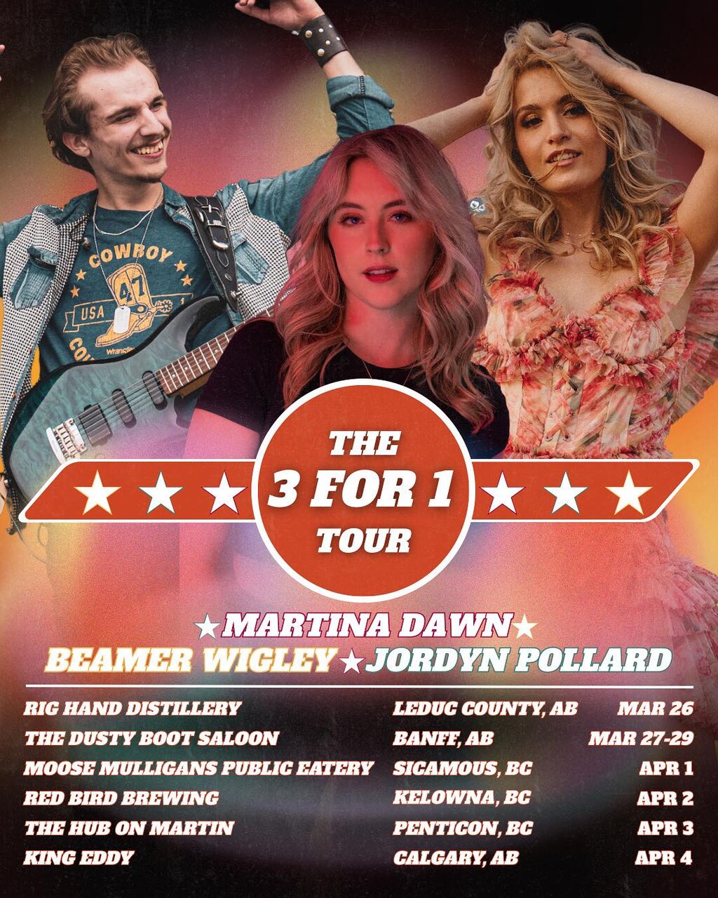 Looking for a night out for a bargain? Well you should check out the 3 for 1 tour! For 1 ticket you will get to see 3 artists from 3 different provinces: Jordyn Pollard (Saskatchewan), Beamer Wigley (British Columbia), and Martina Dawn (Alberta). These three big personalities are sure to make an acoustic style show absolutely worth your while and give you guaranteed giggles and good times. Bringing the Subaru to a show near you starting March 26th.