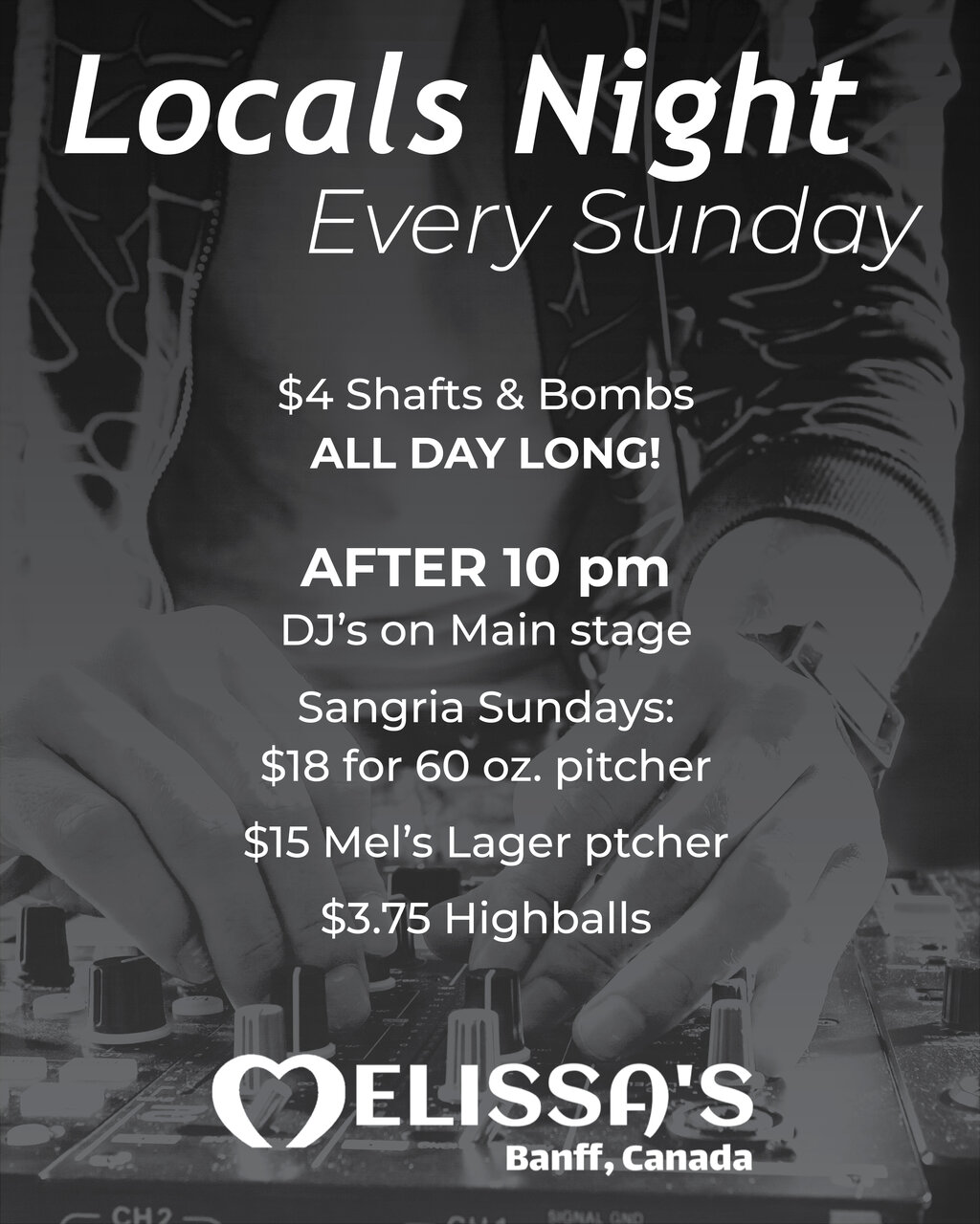 Welcome to Local’s Night - with the best drink deals in the Bow Valley and local DJ’s turning it up on Banff’s Biggest Stage every week! Come party at Mel’s & bring your Sunday Best. 🎉🙌🎉