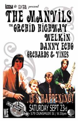 . Saturday, Sept 23rd IMU & CiTR present The Manvils, The Orchid Highway, Welkin, Danny Echo & Orchards & Vines @ The RAILWAY CLUB, 579 Dunsmuir Street . Doors 8:30pm / $10