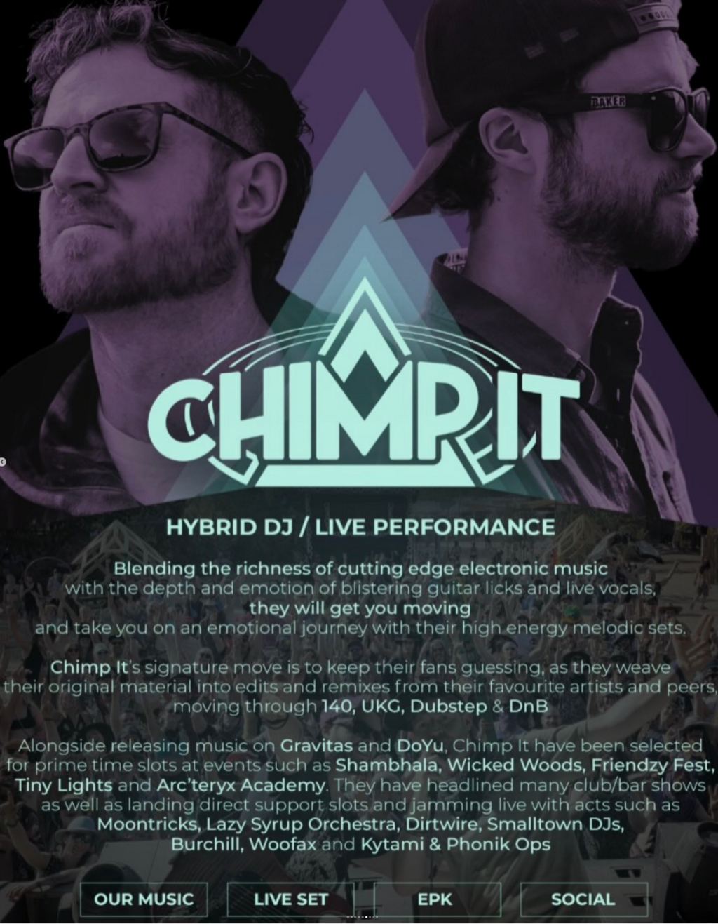 They have been selected for prime time slots at events such as Shambhala, Wicked Woods, Friendzy Fest, Tiny Lights and Arc’teryx Academy. Chimp It has landed many opening slots and jammed live with acts such as Moontricks, Lazy Syrup Orchestra and Kytami & Phonik Ops.