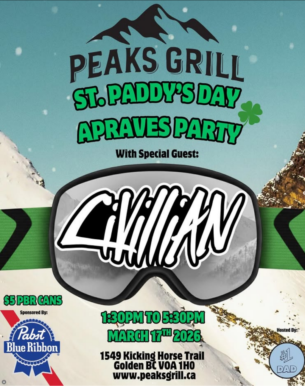 Excited to announce we have special guest @civillianwashere joining us for Apres this St. Paddy’s day at @peaksgrill. Civillian, a Vancouver based artist is coming in hot from the jungles of Costa Rica, recently playing Envision festival. You can regularly find him anywhere from playing vinyl in a speak easy cocktail bar to some of western Canada’s largest music festivals including Wicked Woods, Bass Coast and Shambhala. Big thanks to @pbrcanada who is sponsoring this party with beer specials. This will be a double header with an after party at the @rockwatergrill starting at 10pm.