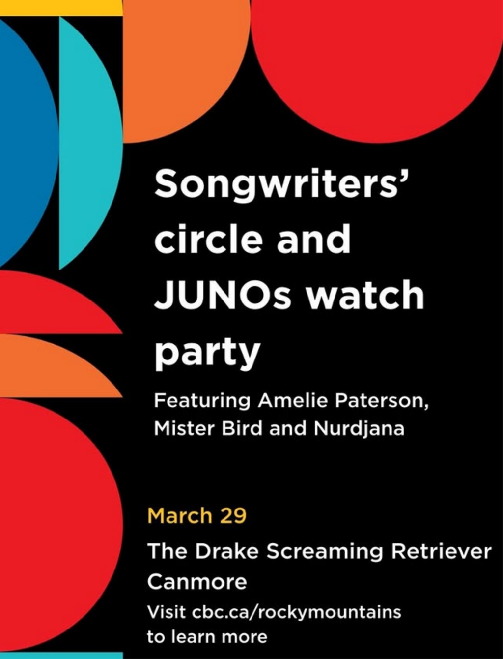 🏆 Followed by JUNOS Watch Party hosted by Mack Meyer with trivia, prizes, including CBC swag and a chance to win two full weekend passes to the Canmore Folk Music Festival!