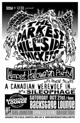 . Saturday, Oct 21st IMU & CiTR present the ALMOST HALLOWEEN PARTY featuring The DARKEST of the HILLSIDE THICKETS with special guests A Canadian Werewolf In... & Sileophage @ The BACKSTAGE LOUNGE on Granville Island (1585 Johnston St.) . 9pm / $10 Advance tickets @ Zulu, Scratch, Red Cat & online @ http://www.imuproductions.com/tix