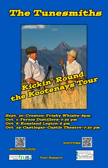 The TuneSmiths perform a wide variety of music from Celtic to traditional folk to the Beatles, John Prine and Ry Cooder, original songs about Kootenay life – hiking, biking and skiing; also humorous and topical ditties about Coca-Cola and plumbers who don’t show up. The TuneSmiths will have the crowd listening, laughing, and maybe even singing and dancing.