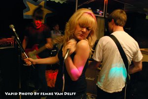 Vapid played next, freshly home from their tour of Eastern Canada and the USA. They are one of my favorite local bands, I just can't get enough of fast punk-rock-with-lady-vocals. Since they have been back, they are playing really tight as a band. Their songs are faster live now too, which I love. Kaitie's vocals get more snotty and aggressive the faster the songs are played, and the audience responds in kind. This show was really confrontational, the band and the fans competing for space on the floor, all heaving together in the throes of punk rock. I can't get enough of that! They busted an amp in one of the first songs (thrashin’ too hard!), but still blasted their way through their set, though they have sounded better in the past. Vapid finished the set with their hit single, anthem for this summer - “Do the Earthquake.” I'm pretty sure the floors of Hoko's shook with all the dancing this song inspired, or at the very least my drink did! Pay attention to this band!