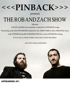 Rob and I wanted to let everyone know that we are planning a West Coast Tour from July 1st -11th 2010. However, these shows will be much different than the past 10 years that we've toured. We've decided to have some fun and present our songs in a new light. Instead of playing our songs the traditional way by having a backup band play all of our extra parts we thought it would be entertaining and fresh for just the two of us to play live. The idea is to present our music at times in a more broken down manner very similar sounding to how it might be for Rob and I when we're coming up with a song for the very first time. Hopefully, this way we can create a new atmosphere for a familiar song. However as we pick each song from our catalog to play we plan on not limiting ourselves to the same formula over and over. We hope to be creative in how we will approach each song individually. This will at times lend to having other elements underneath the both of us while we are playing. The set that we will be playing will cover songs from all our albums to date, and hopefully some new songs from our upcoming record. We're calling this "Pinback Presents the Rob and Zach Show." This by no means signals the end to how we've toured in the past with a full band. We will always continue to perform that way as well. "Pinback Presents" simply gives us and fans another avenue in which to see and hear all the Pinback songs that Rob and I have written over the years and keeps us in a creative space. We're both very much looking forward to this tour and in the the end we think it will be a lot of fun for everyone.
