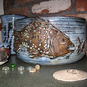 You will find Lyndsay's pottery studio just outside of town overlooking Somenos Lake. Many of the pots are decorated with a West Coast theme featuring landscapes and fish decoration. Enjoy a large selection of wheelthrown functional pottery suitable for day to day use.
