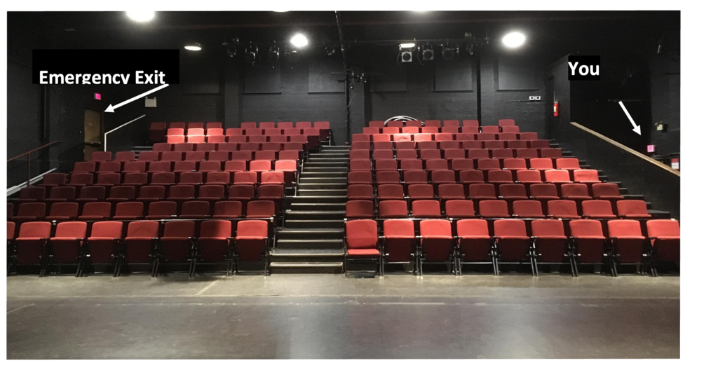 Removable 1st row of seating to accommodate wheelchairs. Accessible washroom on main floor. Option for renter to use all gender washroom signs