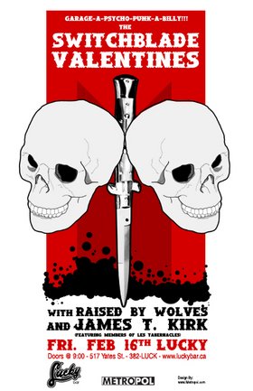 The Switchblade Valentines return to Lucky with Vancouver's Raised By Wolves and The James T Kirks (formerly Les Tabernacles). www.switchbladevalentines.com www.geocities.com/thewolvies
