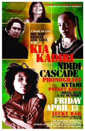 ENIGMATICA ENTERTAINMENT is proud to bring you some of the most talented female MCs in Canada when Kia Kadiri and Ndidi Cascade bless Victoria once again (but this time performing together with prepared material and freestyles on the same bill! They will be joined by westcoast DJ legend Phonograff and Kytami (known as Dream Sequence as a duo) Opening for this powerhouse of Van City talent will be local talents The Pocket Kings and Riegs and Raj accompanied by Vancouver's DJ Dundidit. This will be a most special Friday the 13th hip hop special and will also mark the 10th birthday of Enigmatica Entertainment!