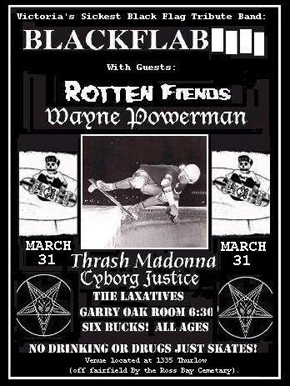 Victoria Punk Rock at it's best: Black Flag Tribute band: BLACK FLAB, RottenFiends, WAYNE POWERMAN, Cyborg Justice, The laxatives, THRASHMADONNA, TBA @ Fairfield Gonzales Community Association - Garry Oak Room Mar 31 2007 - Feb 7th @ Fairfield Gonzales Community Association - Garry Oak Room