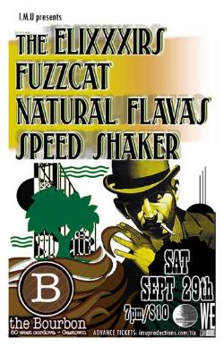 . Saturday, September 29th I.M.U. presents The ELIXXXIRS, FUZZCAT, NATURAL FLAVAS & SPEED SHAKER @ The Bourbon, 50 West Cordova . Doors 7pm - Purchase advance tickets online at http://www.imuproductions.com/tix