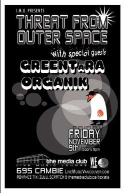 . Friday, November 9th I.M.U. presents THREAT FROM OUTER SPACE w/ GREENTaRA & OR-GAN'IK @ The Media Club, 695 Cambie. $10 Advance / Doors 9pm