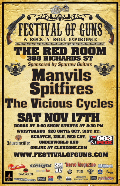 The Nerve Magazine and SPM MUSIC proudly present the 6th Annual Festival of Guns, “A Rock ‘n’ Roll Experience” showcasing some of Vancouver’s best musical talent from the Indie, Rock, Punk and Metal scenes. Since its debut in 2002, “Festival of Guns” has become Vancouver’s definitive indie rock festival featuring new and established talent from the Pacific Northwest. Festival of Guns 2007 is taking place over 4 days from November 15-18, 2007, highlighting over 70 bands with 21 showcases in venues such as; The Plaza Club, The Media Club, The Red Room, The Bourbon, The Railway Club, Pub 340, The Royal Unicorn, Malones, Library Square, The Astoria and The Penthouse. In true festival style, all venues are within walking distance of each other.