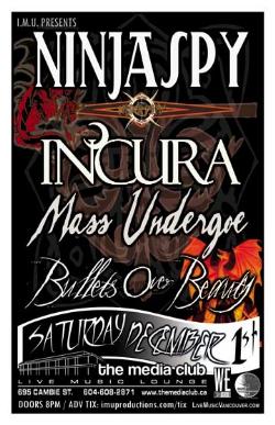 . Saturday, December 1st I.M.U. presents NINJA SPY, INCURA, MASS UNDERGOE & BULLETS OVER BEAUTY @ The Media Club, 695 Cambie. $10 Advance / Doors 8pm - Purchase advance tickets online @ http://www.imuproductions.com/tix