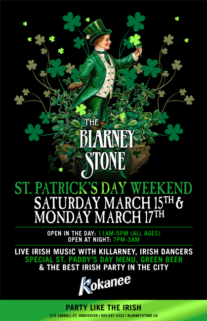 On Saturday March 15, 2008 Vancouver's longest standing Irish Pub is kicking off 2008's weekend to remember. Bring the whole family down from 11:00am - 5:00pm and join in on the full Irish experience. The Blarney Stone will be re-opening the doors at 7:00pm as an adult only (19+) crowd partying to the wee hours of the morning (3:00am). Cover charge is only $5.00 during the day and $15.00 at night. Enjoy our live Irish band "Killarney", Irish Dancers, a full Irish menu, green beer...and more! Get here early for the most memorable Patrick's Party you probably won't remember!! RESERVATIONS WILL NOT BE TAKEN