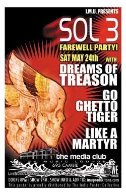 . Saturday, May 24th I.M.U. presents SOL 3, DREAMS OF TREASON, GO GHETTO TIGER & LIKE A MARTYR @ The Media Club, 695 Cambie. Doors 8pm, $10 Advance - Purchase advance tickets online @ www.imuproductions.com