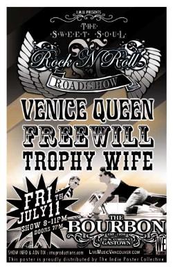 . Friday, July 11th I.M.U. presents The ROCK'N'ROLL ROADSHOW featuring VENICE QUEEN, FREEWILL & TROPHY WIFE @ The Bourbon, 50 West Cordova . Early show 8-11pm sharp / Tix available directly via the bands or purchase advance tickets online @ www.imuproductions.com