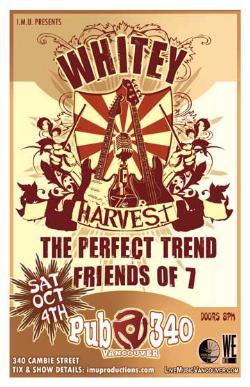 . Saturday, Oct 4th I.M.U. presents WHITEY, The HARVEST, The PERFECT TREND + FRIENDS OF 7 @ PUB 340, Cambie Street / Purchase advance tickets online @ www.imuproductions.com