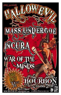 . Friday, Oct 31st I.M.U. presents HALLOWEV'IL with MASS UNDERGOE, INCURA & WAR OF THE MINDS . Early Show 8-11pm @ The Bourbon, 50 West Cordova . Early show 8-11pm sharp - Purchase advance tickets online @ imuproductions.com