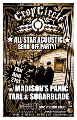 . Thursday Aug 21st I.M.U. presents CROP CIRCLE SEND-OFF PARTY w/ MADISON'S PANIC, TARL & SUGARBLADE @ The Media Club, 695 Cambie . Doors 8pm / Purchase advance tickets online @ www.imuproductions.com