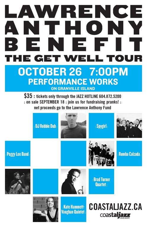 As many of you already know, our long-serving Coastal Jazz production manager Lawrence Anthony suffered a brain hemorrhage in April, 2008. Thankfully, with the support of his family, many friends and colleagues, and through his own sheer dogged determination, Lawrence is making a comeback. However, his road to recovery remains a long and expensive one. To help alleviate the financial burden, and to celebrate a great individual and fellow member of Vancouver’s tight-knit arts community, we are having another fun-filled fundraiser for our dear friend. Come and enjoy a great evening of music and camaraderie while diggin’ the hip sounds of Spygirl, Rumba Calzada, Peggy Lee Band, Kate Hammett-Vaughan Quintet, Brad Turner Quartet, and DJ Robbie Dub. Lots of fundraising pranks included.