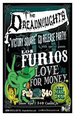 . Saturday, March 14th IMU presents The DREADNOUGHTS "VICTORY SQUARE" CD RELEASE PARTY with special guests LOS FURIOS & LOVE FOR MONEY (featuring former members of The FLAIRS) @ PUB 340, 340 Cambie Street . Doors 8pm / Purchase advance tickets directly via the bands & online @ www.imuproductions.com
