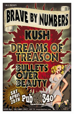 . Saturday, April 25th IMU presents BRAVE BY NUMBERS, KUSH, DREAMS OF TREASON & BULLETS OVER BEAUTY @ PUB 340, 340 Cambie Street . Doors 8pm / Purchase advance tickets online @ www.imuproductions.com