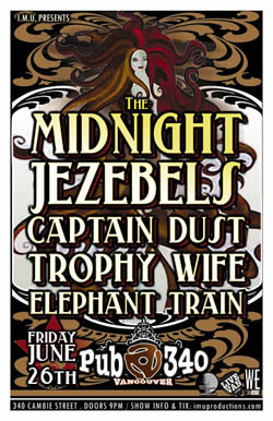 . Friday, June 26th IMU presents The MIDNIGHT JEZEBELS, CAPTAIN DUST, TROPHY WIFE & ELEPHANT TRAIN @ PUB 340, 340 Cambie Street . Doors 9pm / Purchase advance tickets directly via the bands & online @ www.imuproductions.com