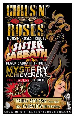 . Friday, September 25th IMU presents GIRLS N ROSES, SISTER SABBATH & MYSTERY ACHIEVEMENT ~ An all girl tribute band night w/ Connie, The Evil Nun's Birthday Party! @ The Fairview Pub, 898 West Broadway . Doors 8pm / Purchase advance tickets online @ www.imuproductions.com