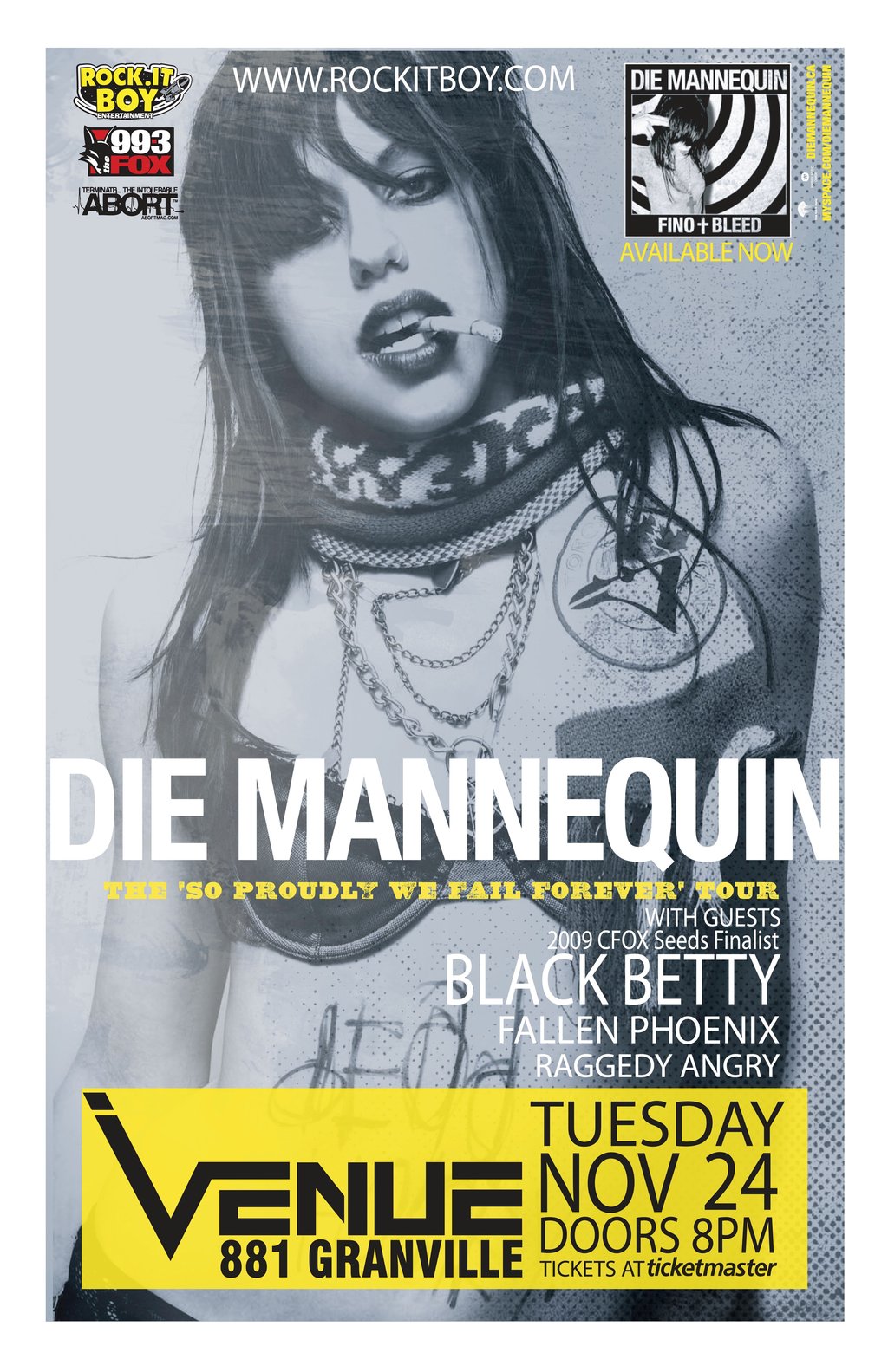 The Fox 99.3 FM and Rock.It Boy Entertainment present DIE MANNEQUIN on the ‘So Proudly We Fail’ tour with special guests 2009 Fox Seeds finalists BLACK BETTY, FALLEN PHOENIX, and RAGGEDY ANGRY on Tuesday, November 24th at VENUE on Granville St. in Vancouver Tickets are on sale for $12 (plus Service Charges) at all Ticketmaster outlets or $15 at the door..