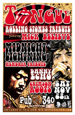 . Saturday, November 28th IMU presents TONGUE Rolling Stones Tribute featuring MICK BELIEVE, MIDNIGHT LIGHTNING Hendrix Tribute, CRIMSON ROOTS & DANNY ECHO @ PUB 340, 340 Cambie Street . Doors 8pm / Purchase advance tickets online @ www.imuproductions.com