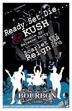 . Friday, January 29th IMU presents READY.SET.DIE & KUSH Double EP Release Party w/ SCARLET REIGN @ The Bourbon, 50 West Cordova . Early show 8-11pm sharp / Purchase advance tickets available directly via the bands & online @ www.imuproductions.com