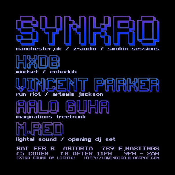 vancouver has had it's share of techno-slanted, more experimental, and (OF COURSE) banging dubstep headliners thru town. but this may be the first dubstep artist that is undeniably "deep", with a serious leaning towards the 2-step, to come delivery the goods. SYNKRO's sound could be described as moody, without the "dark", or hypnotic without the heaviness.. definetely complex without losing the dancefloor (yes!)
