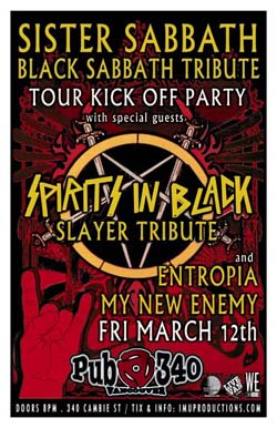 . Friday, March 12th IMU presents SISTER SABBATH Black Sabbath Tribute Tour Kick Off Party w/ SPIRITS IN BLACK Slayer Tribute, MY NEW ENEMY & ENTROPIA @ PUB 340, Cambie Street / Purchase advance tickets online @ http://www.imuproductions.com