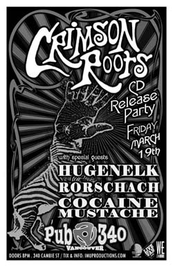 . Friday, March 19th IMU presents CRIMSON ROOTS CD Release Party w/ special guests HUGENELK, RORSCHACH & COCAINE MUSTACHE @ PUB 340, Cambie Street / Purchase advance tickets online @ http://www.imuproductions.com