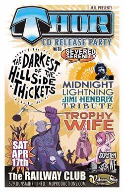 . Saturday, April 17th IMU presents THOR CD Release Party & Tour Kick-Off w/ special guests The DARKEST OF THE HILLSIDE THICKETS, TROPHY WIFE & MIDNIGHT LIGHTNING Hendrix Tribute @ The Railway Club, 579 Dunsmuir . Doors 9pm / Cover $10 @ the door