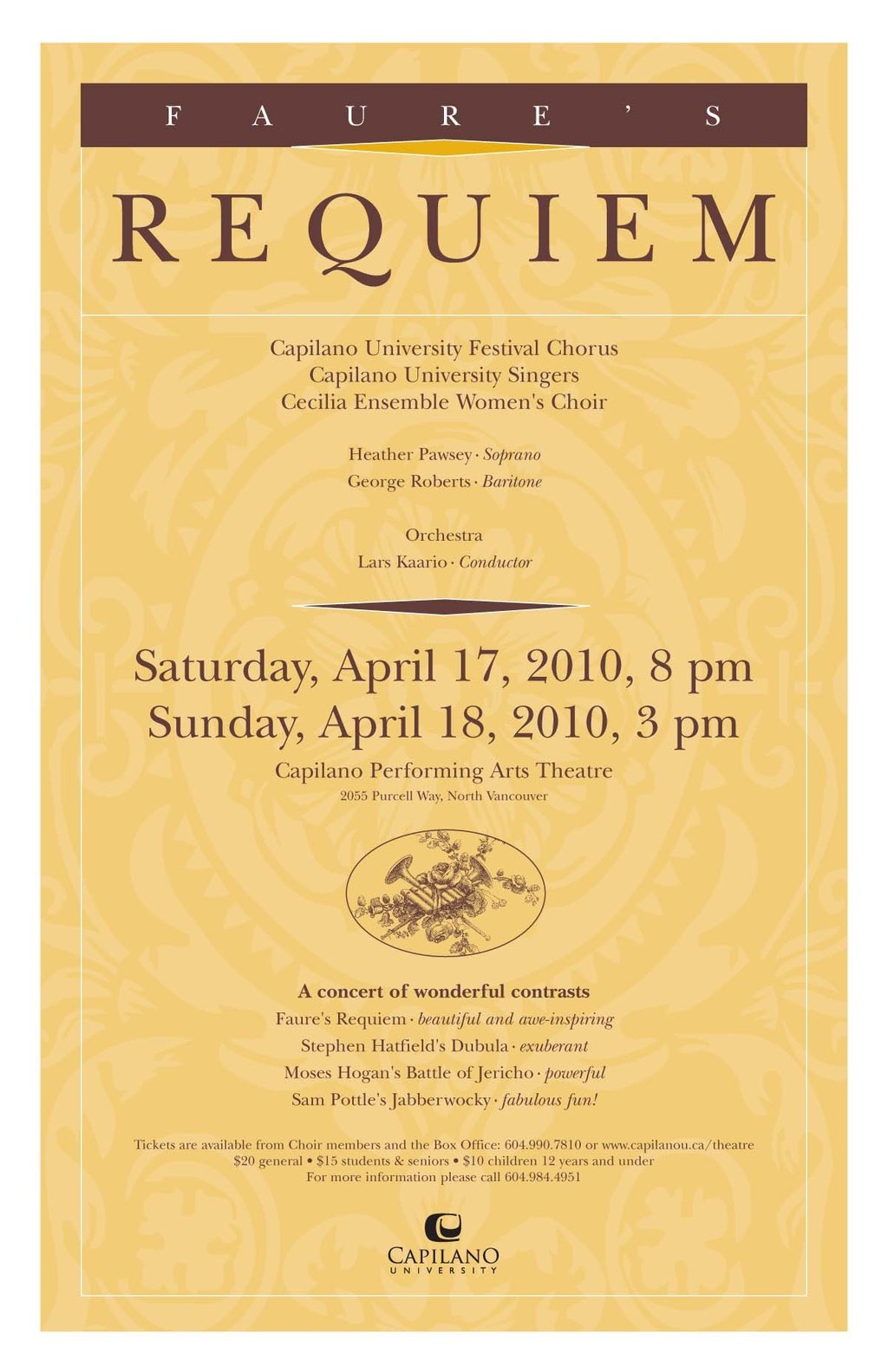 Capilano University presents a concert of wonderful contrasts: Faure’s awe-inspiring Requiem; Stephen Hatfield’s exuberant Dubula; Moses Hogan’s powerful Battle of Jericho, and Sam Pottle’s “frabjous” Jabberwocky!