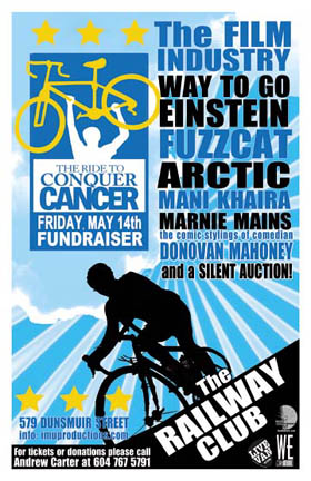 . Friday, May 14th IMU presents RIDE TO CONQUER CANCER FUNDRAISER featuring The FILM INDUSTRY, WAY TO GO EINSTEIN, FUZZCAT, ARCTIC, MANI KHAIRA, AMRNIE MAINS & comedian DONOVAN MAHONEY @ The Railway Club, 579 Dunsmuir . Show 8pm sharp / For tickets, donations or more info, please call Andrew Carter at 604 767 5791